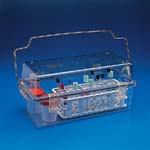 Izgatavots no PC. Paraugu un reaģentu glabāšanai vai drošai bīstamu vielu transportēšanai. Ģeometriskais vāks un skavas. Divi sānu rokturi un viens pamatrokturis izgatavoti no augstas kvalitātes tērauda. Izmēri: D330xP175x180mm. Autoklāvējams.