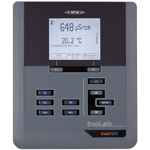 Laboratorijas konduktometrs WTW ino Lab Cond 7310 ar lielu daudzfunkcionālu displeju, paralēli ar temperatūras mērīšanu un automātiskas lineāra un nelineāra termokompensācijas līdz 20 °C vai 25 °C. Mērījumu rezultāti var tikt pārstāvēti TDS vienības.