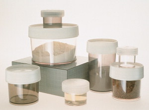 Konteineri ar platu kaklu paraugu aizpildīšanai.