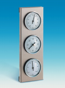 Par iekšpuses un ārpuses. Ar higrometru, barometru un termometru. Nerūsējošā tērauda gadījumā. Izmēri: W 95 x H 280 x D 18 mm, displeja instrumenti Ø 70 mm, svars 380 g.