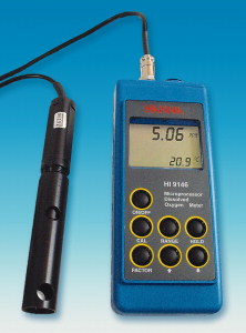 Ūdensnecaurlaidīgie portatīvie mikroprocesoru oksimetri HI-9146 Hanna instruments izšķīdušā skābekļa analīzei ar automātisku kalibrēšanu gaisā.