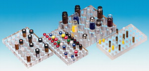 Made of acrylic. Transparent material allows easy checking of the filling level of the vials in the stand. With silicon feet for stability and stack ability.