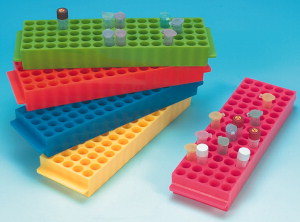 Statīvi mēģenēm PP, 80 marķēti caurumi 5 x 16,mēģenēm 1,5 un 2 ml, L 210 x W 65 x H 27 mm, avtoklav.