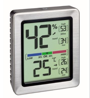 Telpas klimata kontrolei. Krāsainās komforta zonas norāda, vai vērtības ir optimālas, pārāk mitras vai pārāk sausas. Tendenču bultiņas informē par temperatūras un mitruma vērtību izmaiņām.